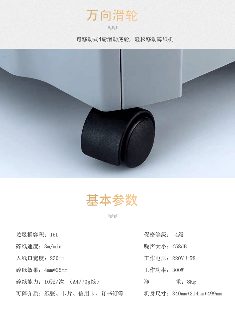 额定电压220V额定功率230碎纸能力10(张/次)碎纸效果4*25外形尺寸340*214*499重量8品牌汇远型号HY-2308D纸屑容量15(L)
